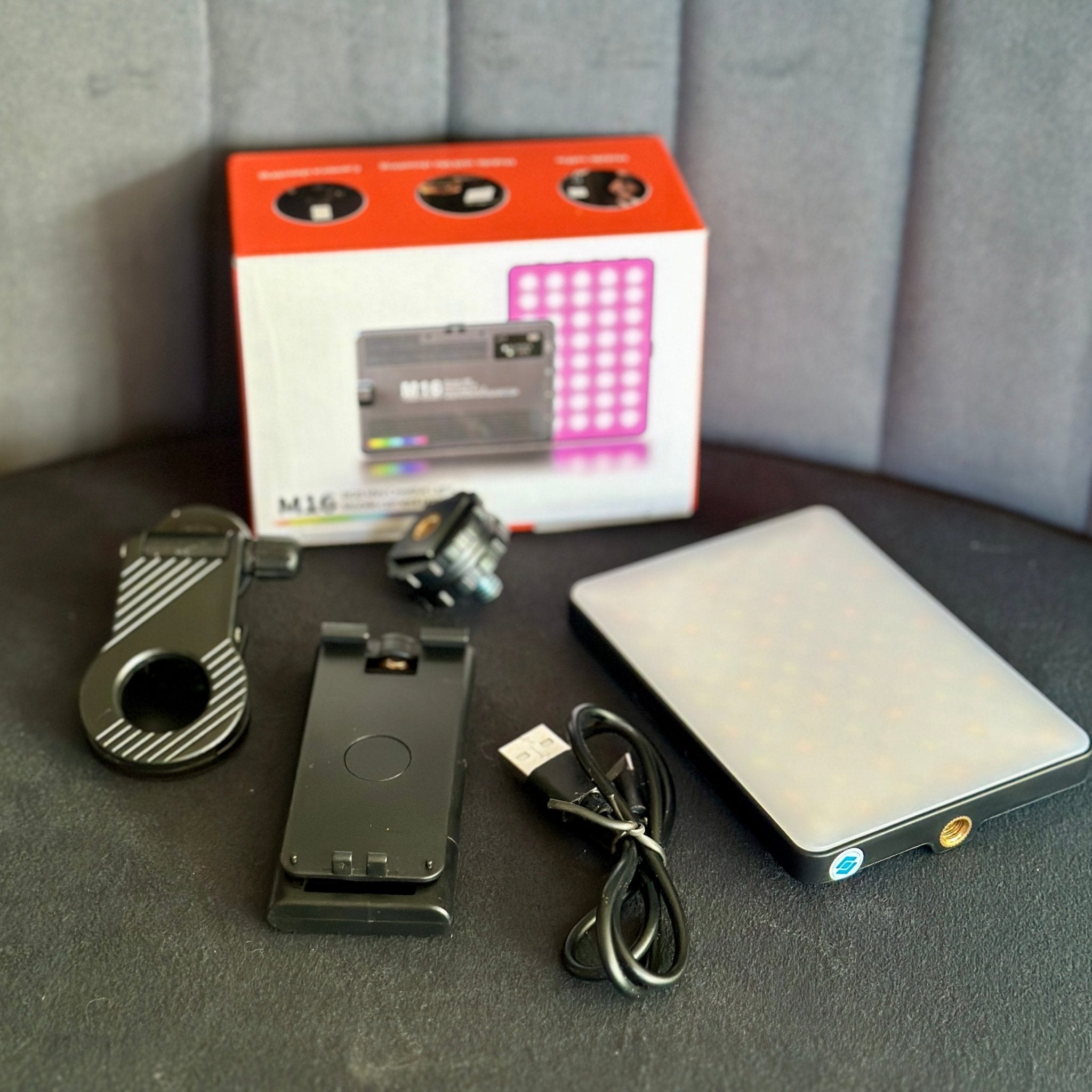 Luz led M16 RGB 🌈 con pantalla y triple adaptador